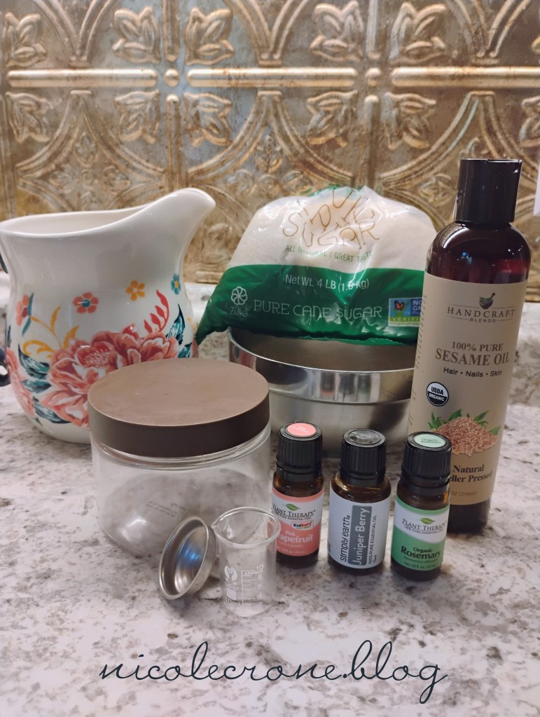 This is a super easy recipe to make. All you need is a container, sugar, a carrier oil, and Juniper berry, Rosemary, and Grapefruit essential oils.