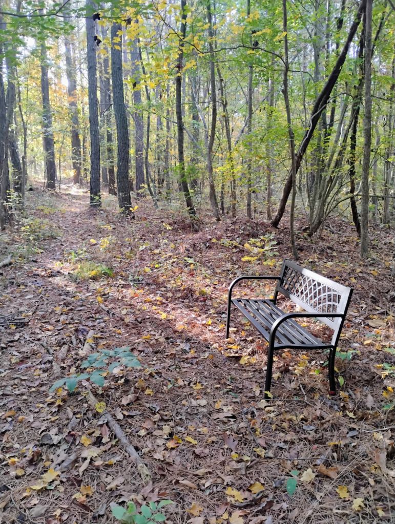 Finally, here is a picture of our bench in the forest, with the light streaming in just so. This is a beautiful place to sit, and just think. I love to steal a few minutes on this bench to listen to the sounds of nature.